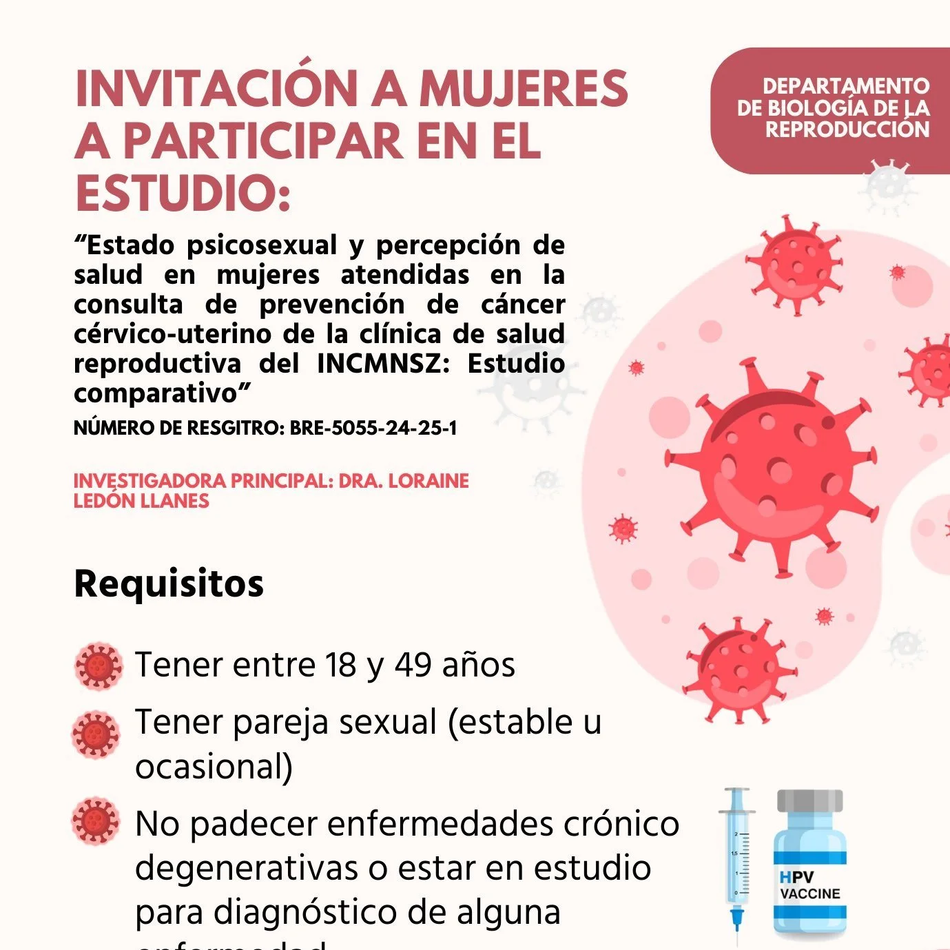 Invitación a participar en el estudio: Estado psicosexual y percepción de salud en mujeres atendidas en la consulta de prevención de cáncer cérvico-uterino en la clínica de salud reproductiva del INCMNSZ - estudio comparativo